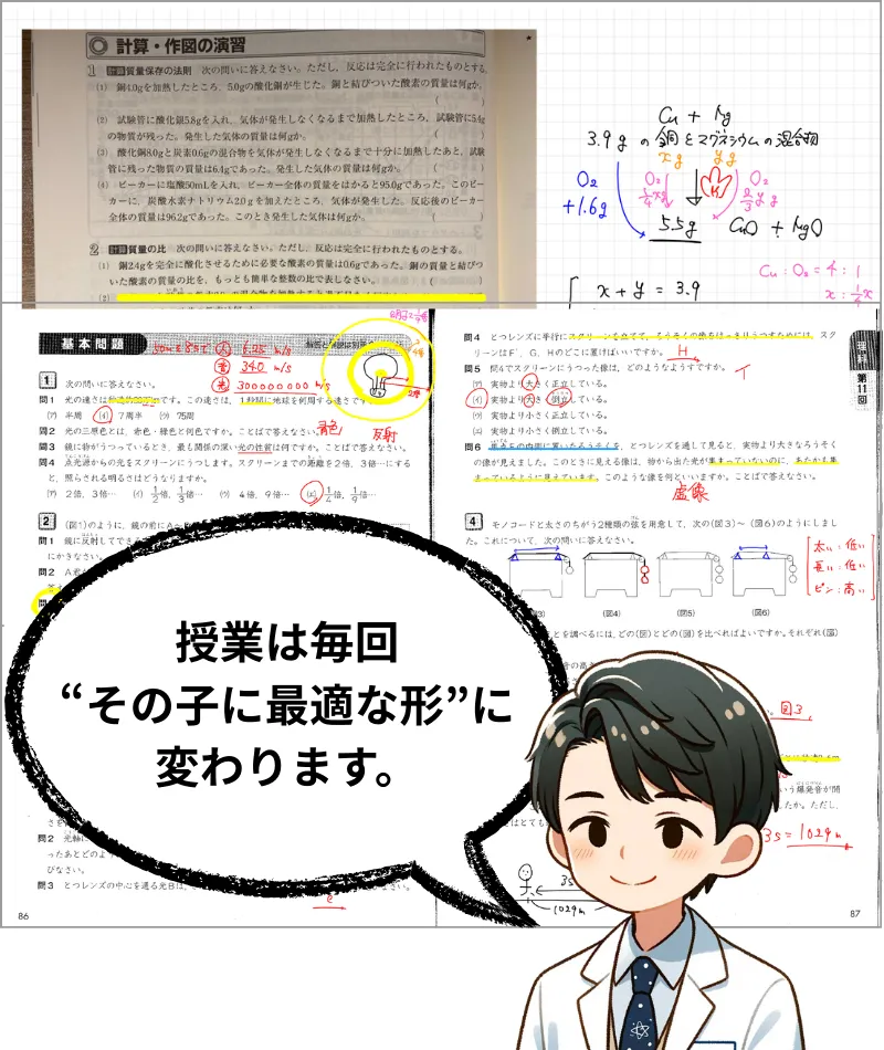 理解の階段を一段ずつ一緒にたどる授業なので、「わからないところがわからない」状態からでも安心して始められます。