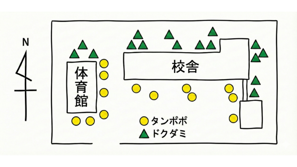 タンポポは校舎の南側に多くて、ドクダミは北側に多くなっています。