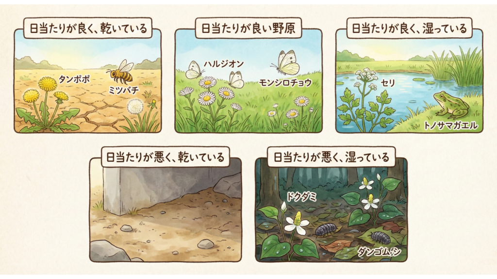 生き物の種類を見れば、その場所の「環境(日当たり・湿り気)」がわかる!