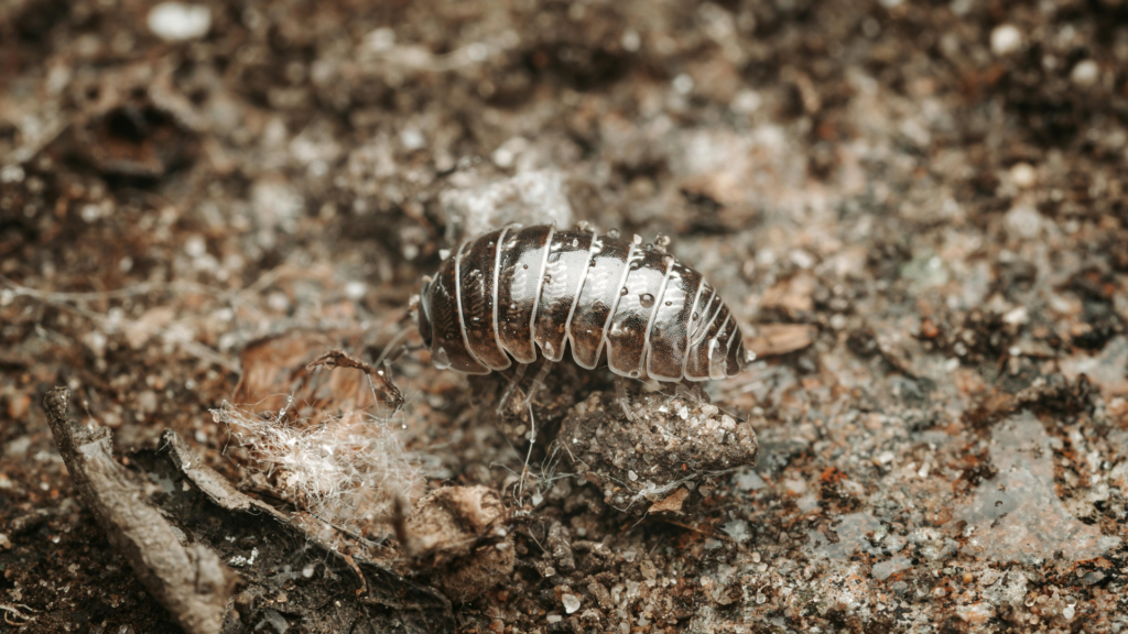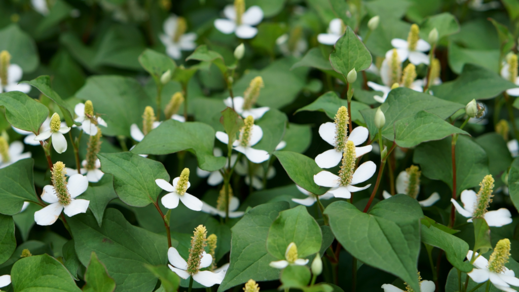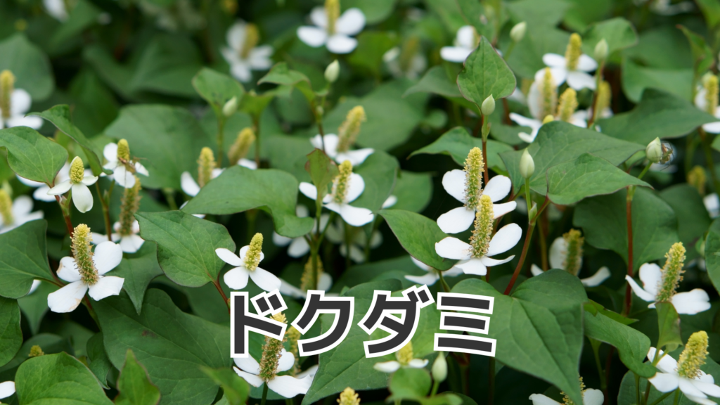 日当たりが悪く、湿っているドクダミ、ダンゴムシ