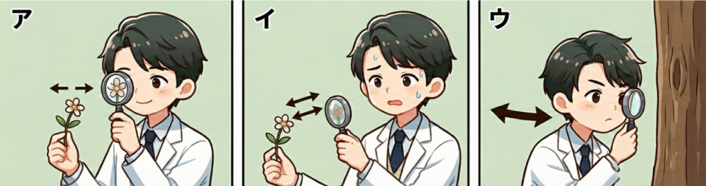ここでクイズ!ルーペの使いかた、正しいのはどーれだ?